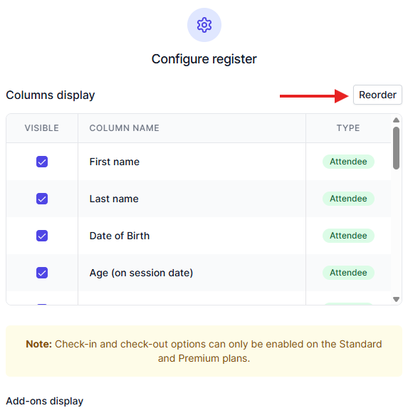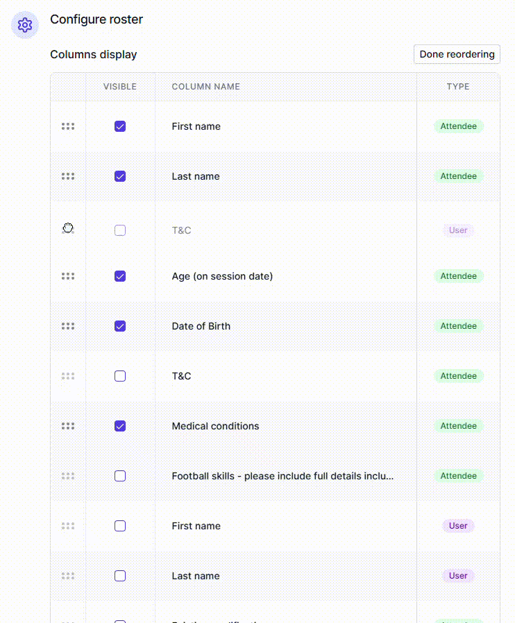 • Reordering: To rearrange the order of columns (for viewing or for downloadable registers), First click on Configure then click the Reorder button. You can then simply drag and drop the columns into your preferred sequence.