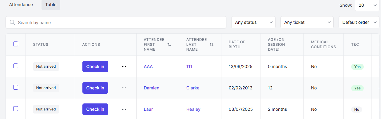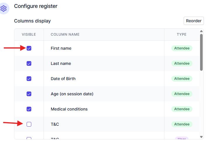 You choose exactly what information appears on your register by ticking the specific fields you've set up. Once a field is ticked, it will immediately display on your register. More details on configuring fields can be found on the Field Configuration help page.